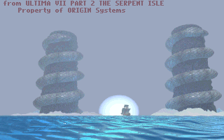 A screen shot of the Avatar's ship sailing between the Serpent Pillars, heading to the Serpent Isle. This is a scene from the begining of Ultima VII Part II: The Serpent Isle. 320x200x256 Compuserve .gif format.