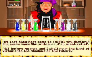 A screen shot of the Gypsy wagon in Ultima VI: The False Prophet. 320x200x256, Compuserve GIF format.