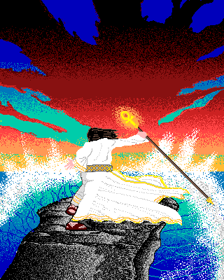 An unknown artists' drawing of the cover to Ultima IV: Quest of the Avatar. 320x400x16, Compuserve .gif format.
